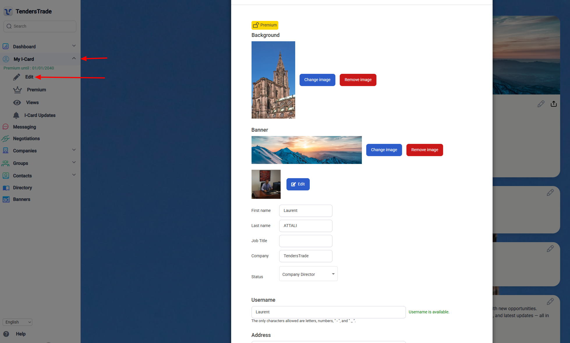 Pour créer votre i-Card, connectez-vous à votre compte TendersTrade et ouvrez la rubrique « Mon compte > i-Card ».