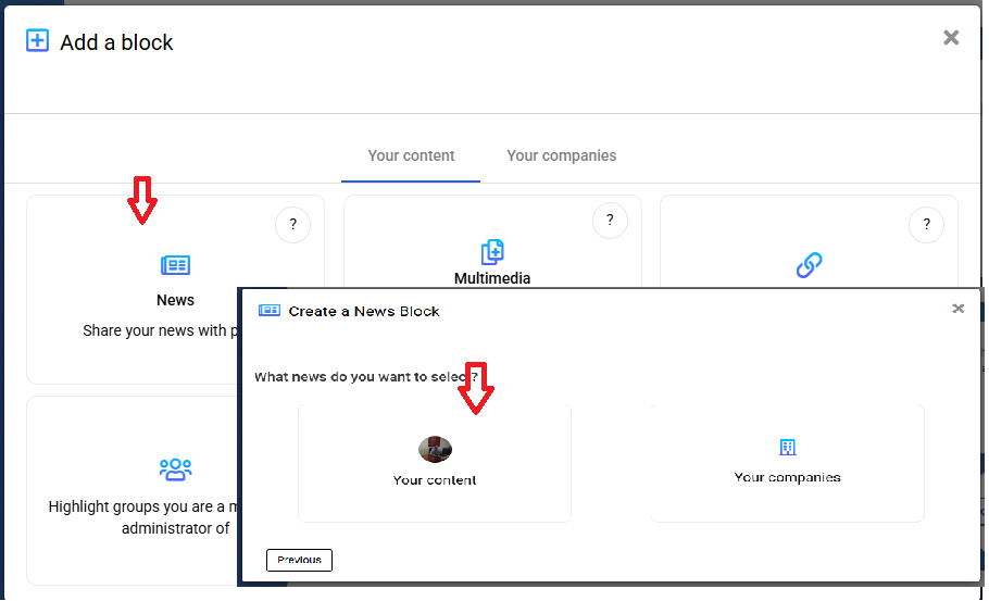 - Groupes : pour mettre en avant les groupes dont vous êtes membre ou administrateur.