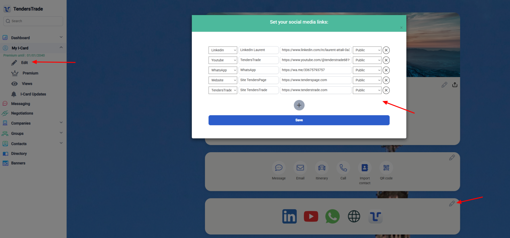 - En haut de votre i-Card, vous pouvez placer vos principaux liens. Il est possible de les rendre publics ou seulement pour vos contacts. Cela sera intéressant pour la diffusion de votre WhatsApp par exemple.