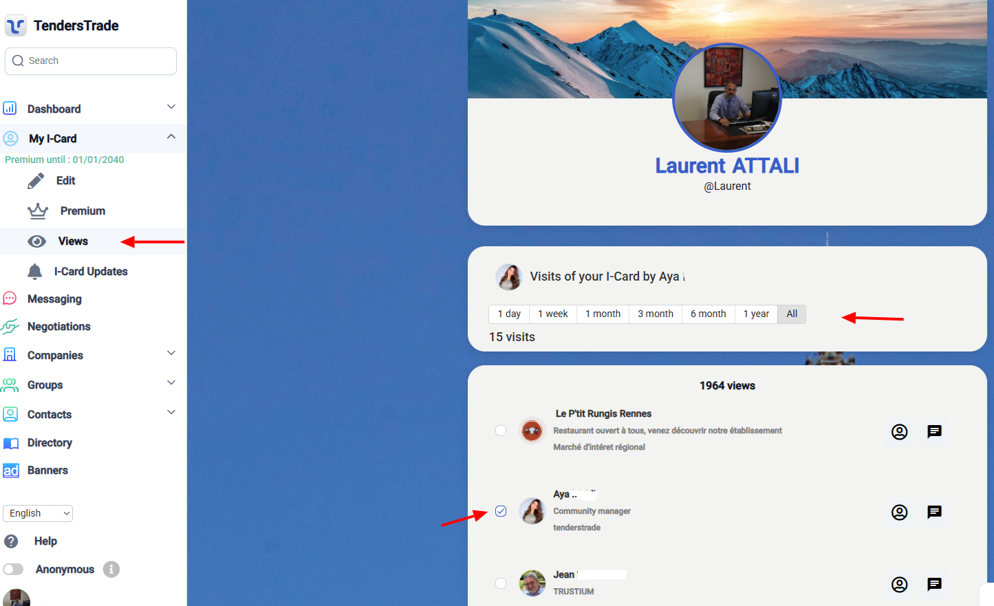 - Les visiteurs inscrits sur TendersTrade : dans ce cas, nous vous communiquons les noms et entreprises des personnes qui visitent votre i‑Card, avec un lien vers leur i‑Card et la possibilité de les contacter.
